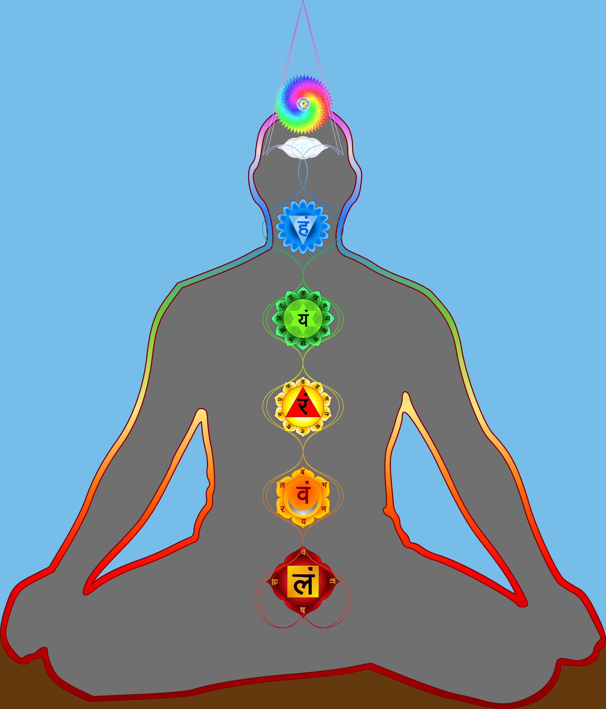 Aryuvedic tradition describes seven major energy centers that run along the spine and spiral out the front and back of the body in clockwise vortices. The Sanskrit word for these centers is chakra, meaning “wheel of light”.